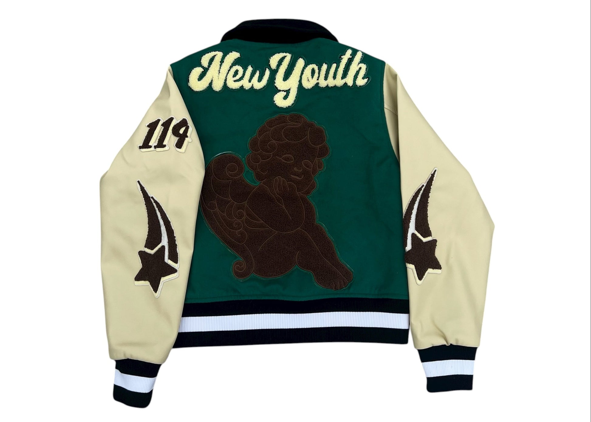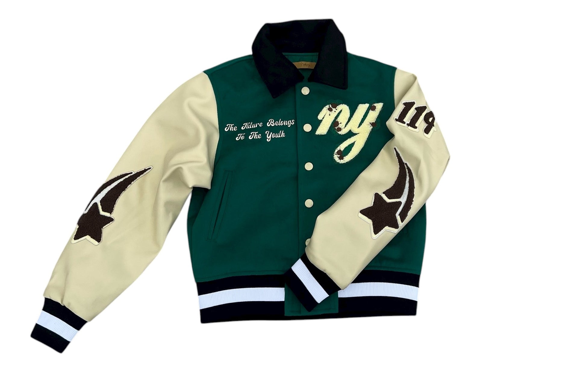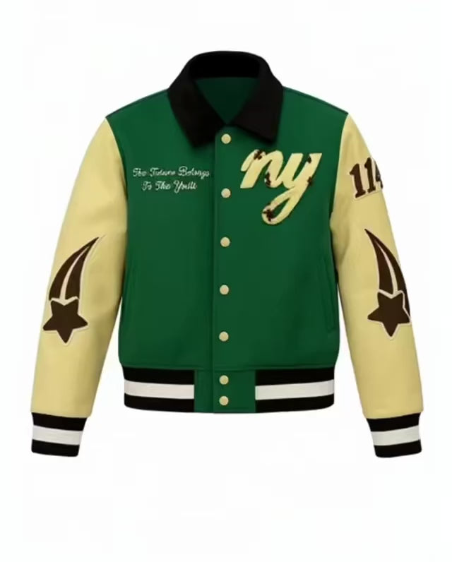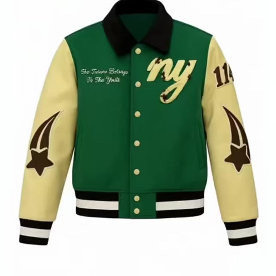 New Youth Autumn Woods Varsity made of genuine leather with cotton blend inside featuring embroidered patches